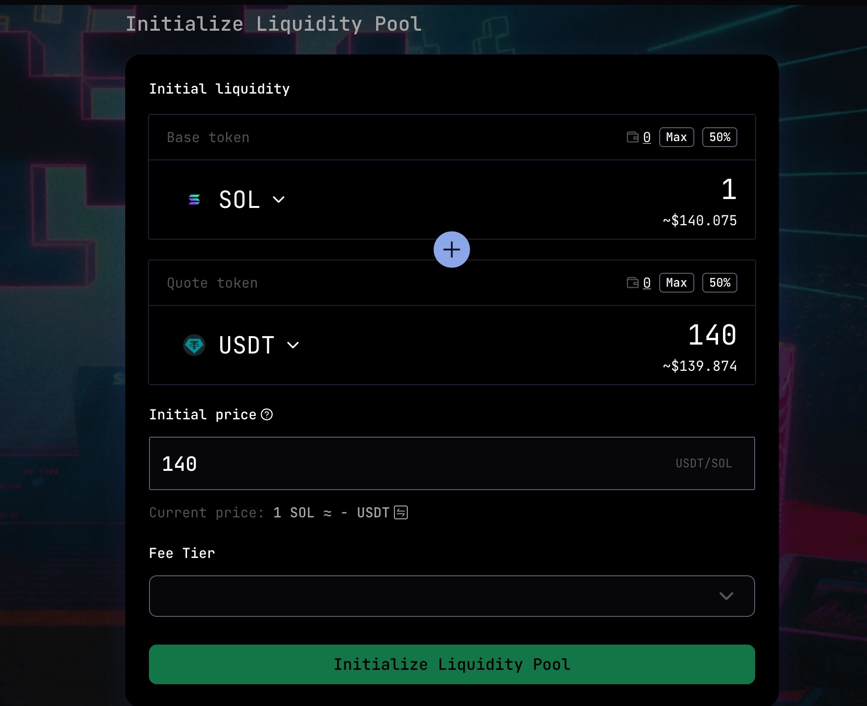 Confirm you have enough funds in your wallet to cover the initial liquidity, then click "Initialize Liquidity Pool".