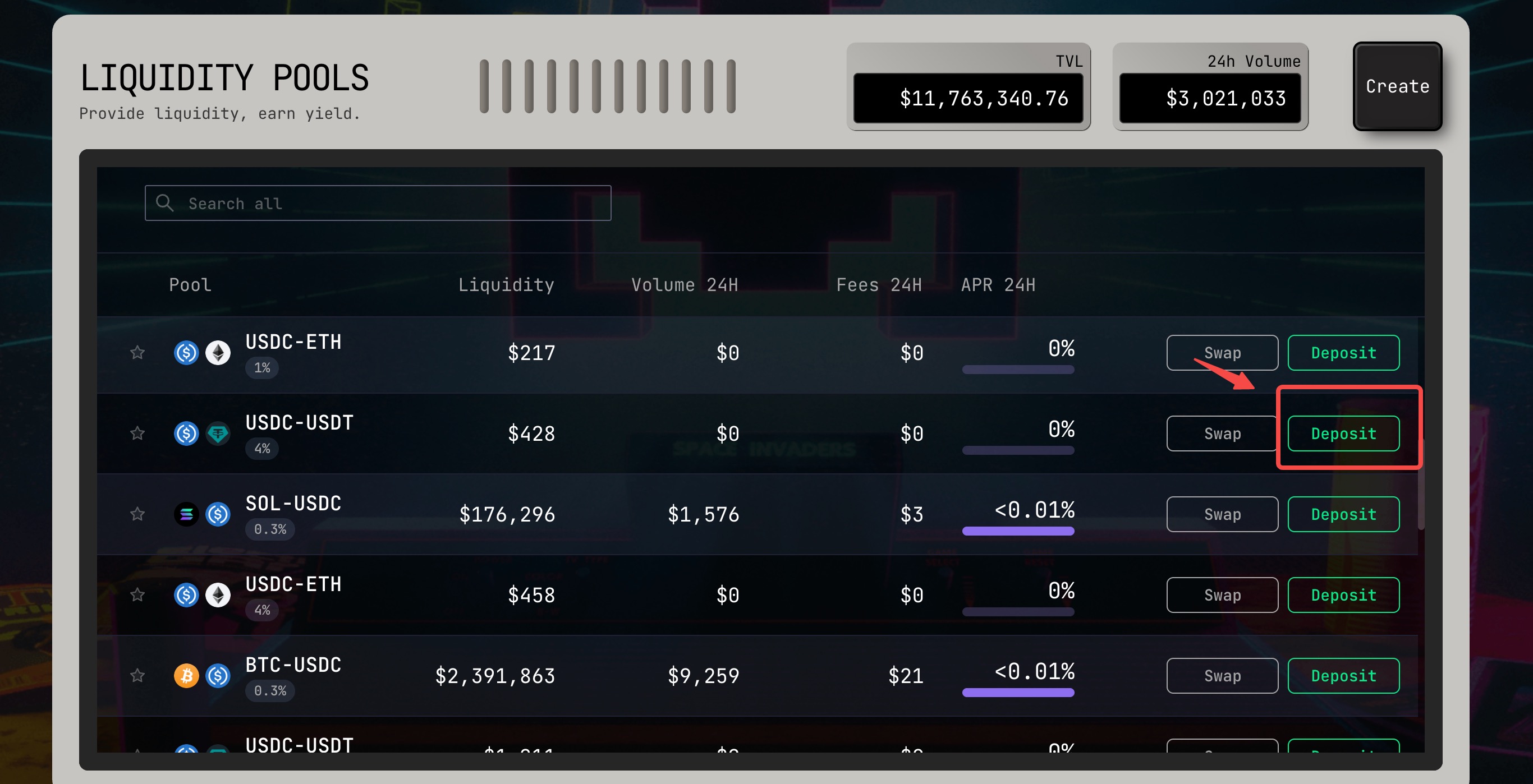 Go to the **Liquidity** page and locate the **USDC-USDT** pool. Click **"Deposit"** next to it.